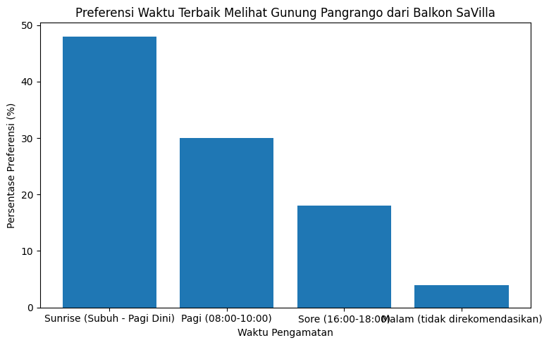 Berikut ringkasan data singkat hasil survei kecil (sample tamu Saavilla & pengunjung) tentang waktu favorit melihat Gunung Pangrango dari balkon: